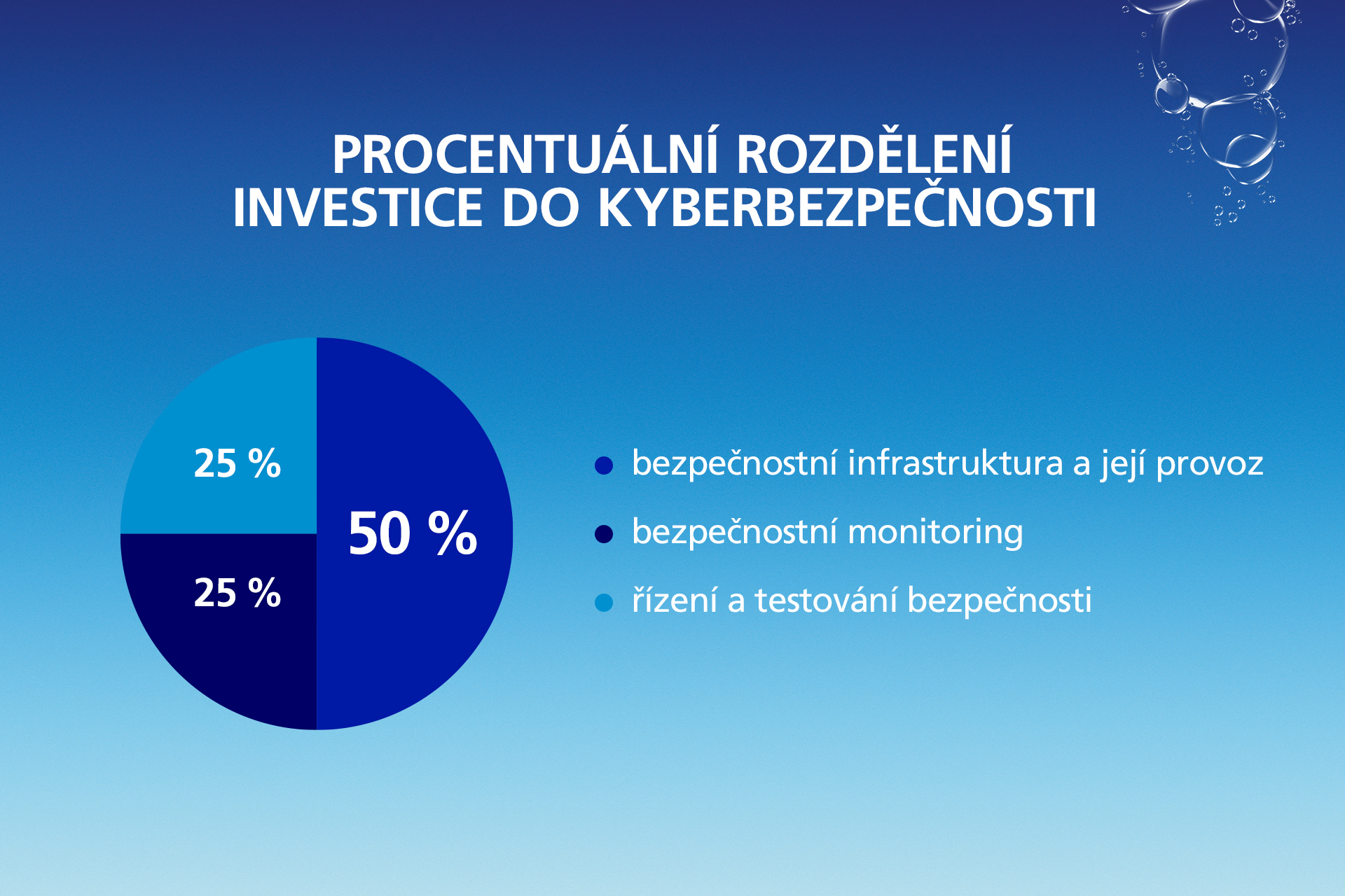 Vyhrazené peníze rozdělte následovně: 50 % pro bezpečnostní infrastrukturu a její provoz, 25 % pro bezpečnostní monitoring a zbývajících 25 % pro řízení a testování bezpečnosti.